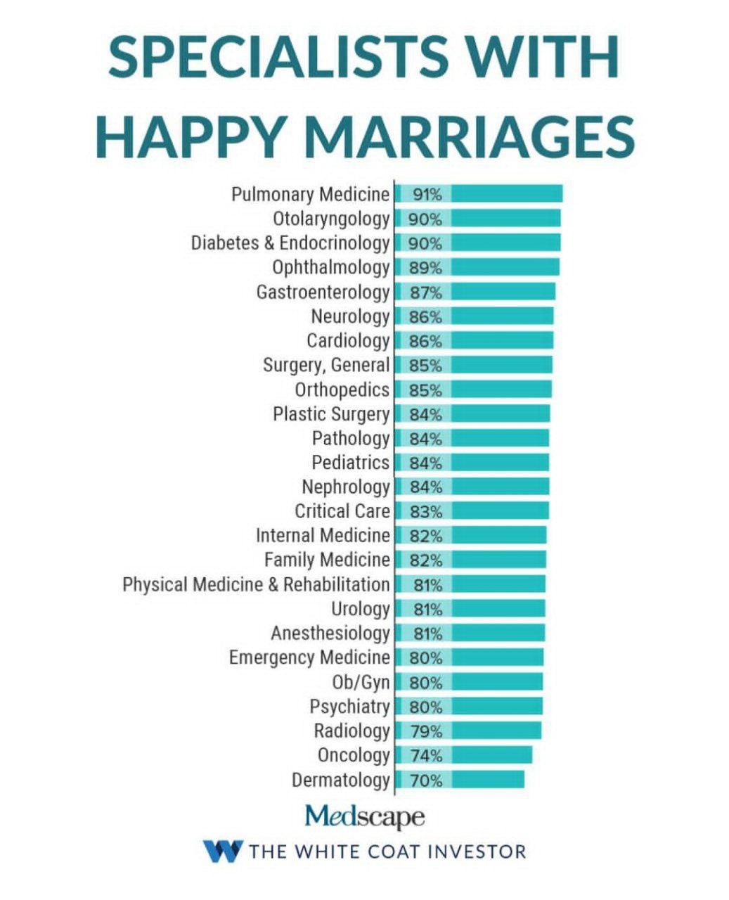 انکولوژی با ۷۴ درصد و درماتولوژی با ۷۰ درصد رضایت کمترین میزان رضایت زناشویی را ثبت کرده‌اند. تحلیل‌گران Medscape معتقدند در مورد